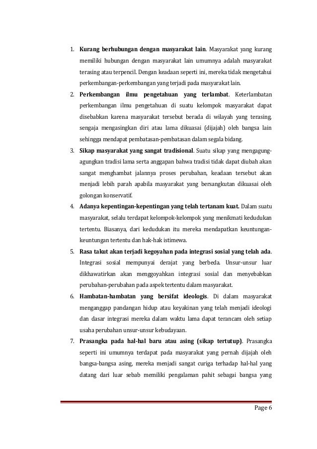 Faktor Penghambat Perubahan Sosial from imgv2-2-f.scribdassets.com 5) terdapat prasangka terhadap budaya lain. 4) sikap masyarakat yang masih tradisional. Oct 09, 2020 · selain faktor penyebab dan penghambat perubahan sosial budaya kita juga harus memahami mengenai teori perubahan sosial budaya, akibat adanya perubahan sosial budaya, tipe masyarakat dalam menyikapi perubahan sosial budaya, dan juga pengaruh atau dampak dari adanya perubahan sosial budaya terhadap perilaku masyarakat yang ada di indonesia. Apakah perubahan budaya dan penemuan baru terjadi? 2) adanya adat yang mengikat. May 13, 2017 · 15 faktor penghambat perubahan sosial budaya beserta penjelasannya. Aug 17, 2021 · c. 3) takut terjadi guncangan budaya.
